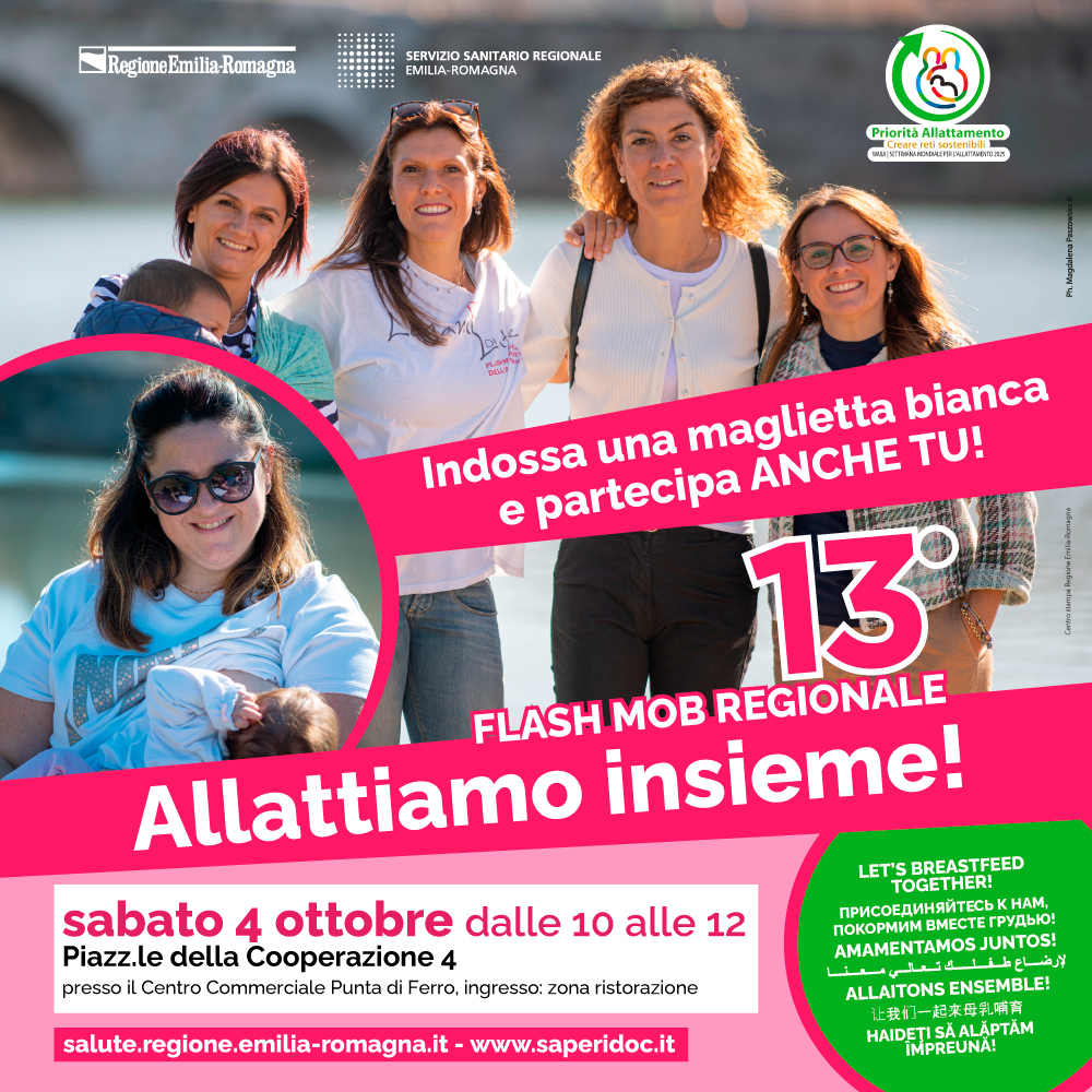 Sabato 4 ottobre dalle 10 alle 12 torna il 13° Flash Mob Regionale – Allattiamo insieme!Ti aspettiamo al Puntadiferro (zona ristorazione).Indossa una maglietta bianca e partecipa anche tu a questa grande iniziativa dedicata all’allattamento!